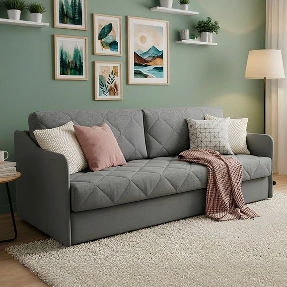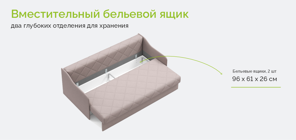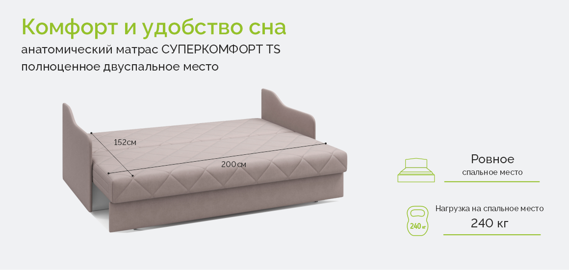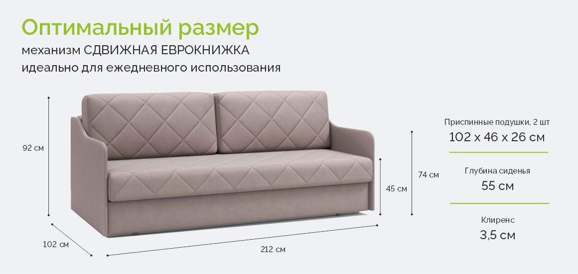 Компактный диван с пышной стежкой – идеален для уютного и лаконичного интерьера. Узкие подлокотники с плавной геометрией добавляют динамику пространству. Модель доступна в двух вариантах: сдвижная еврокнижка и пантограф. Вне зависимости от выбранной версии диван имеет полноценное спальное место с анатомическим матрасом, созданным по технологии TOP sleep.