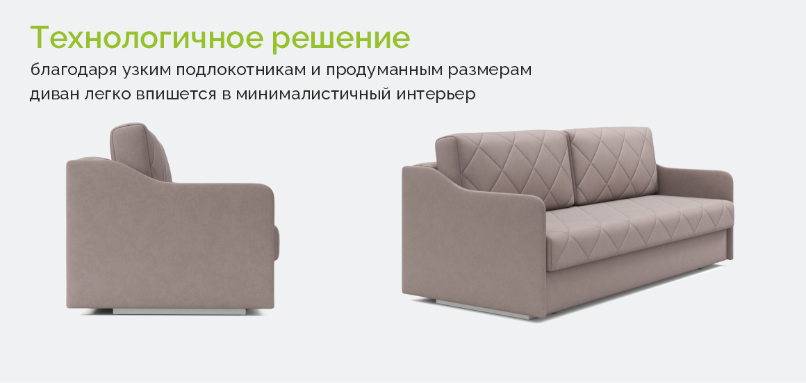 • Узкие подлокотники экономят пространство и позволяют ставить диван в нишу или другое ограниченное пространство.