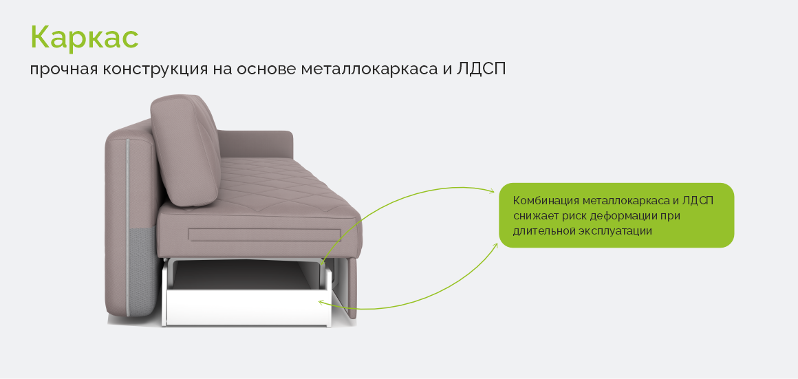 • Каркас – прочная конструкция на основе металлокаркаса и ЛДСП.