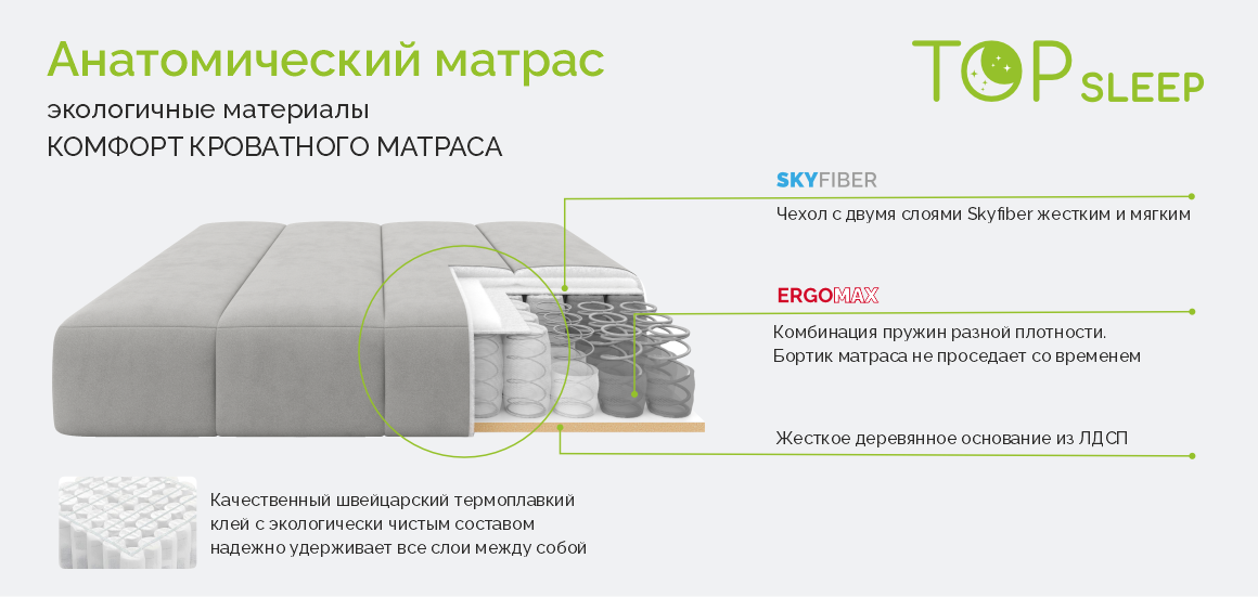 • Новый анатомический матрас Суперкомфорт TS на основе блока независимых пружин с обкладкой пружин большей жесткости по периметру обеспечивает дополнительную устойчивость матраса, не позволяя бортику матраса проседать.