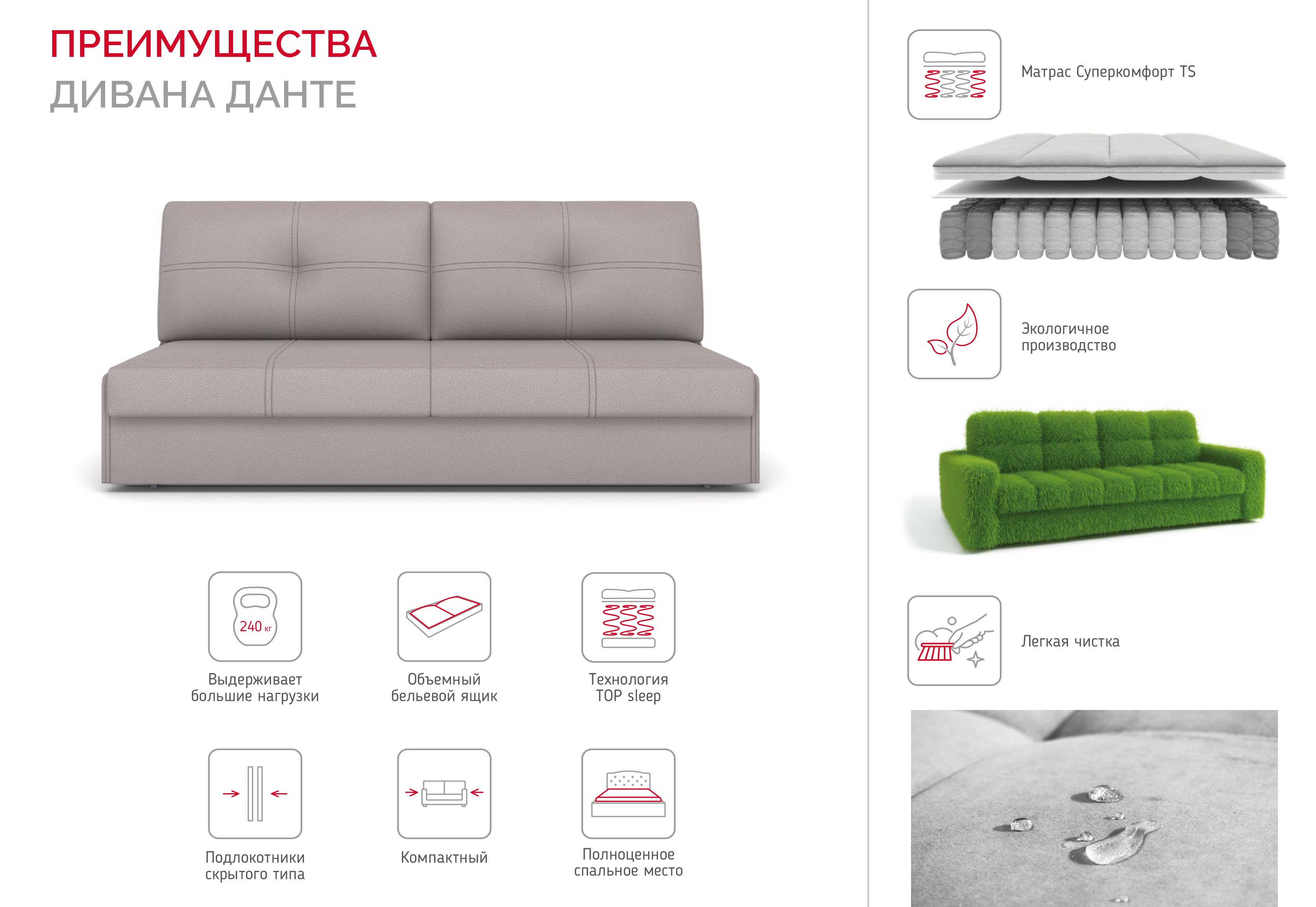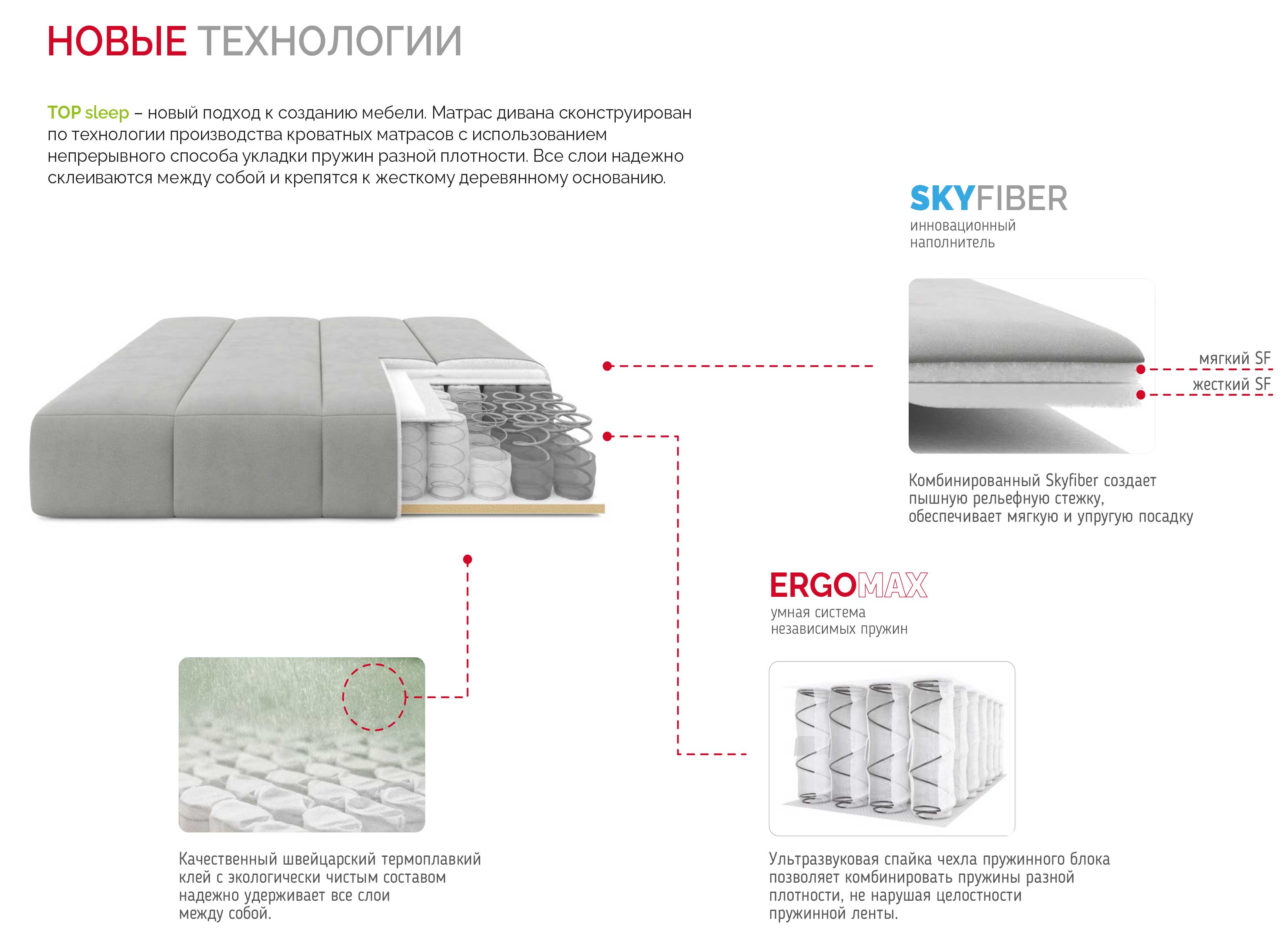 Компактный и технологичный диван ДАНТЕ — современное решение для вашего дома, сочетающее в себе стиль и функциональность. Если вы ищете мебель для малогабаритных квартир, небольших помещений или ниш, эта модель станет идеальным выбором. Благодаря эргономичным размерам и лаконичному дизайну, диван отлично впишется в любой интерьер. Главная особенность — полноценное спальное место с новым анатомическим матрасом Суперкомфорт TS на основе блока независимых пружин, который подстраивается под разный вес людей и обеспечивает идеальную поддержку спины во время сна. Технология TOP sleep и объемный рельефный чехол гарантируют максимальный комфорт и воздухопроницаемость, а приспинные подушки с инновационным наполнителем Skyfiber делают отдых ещё приятнее.
