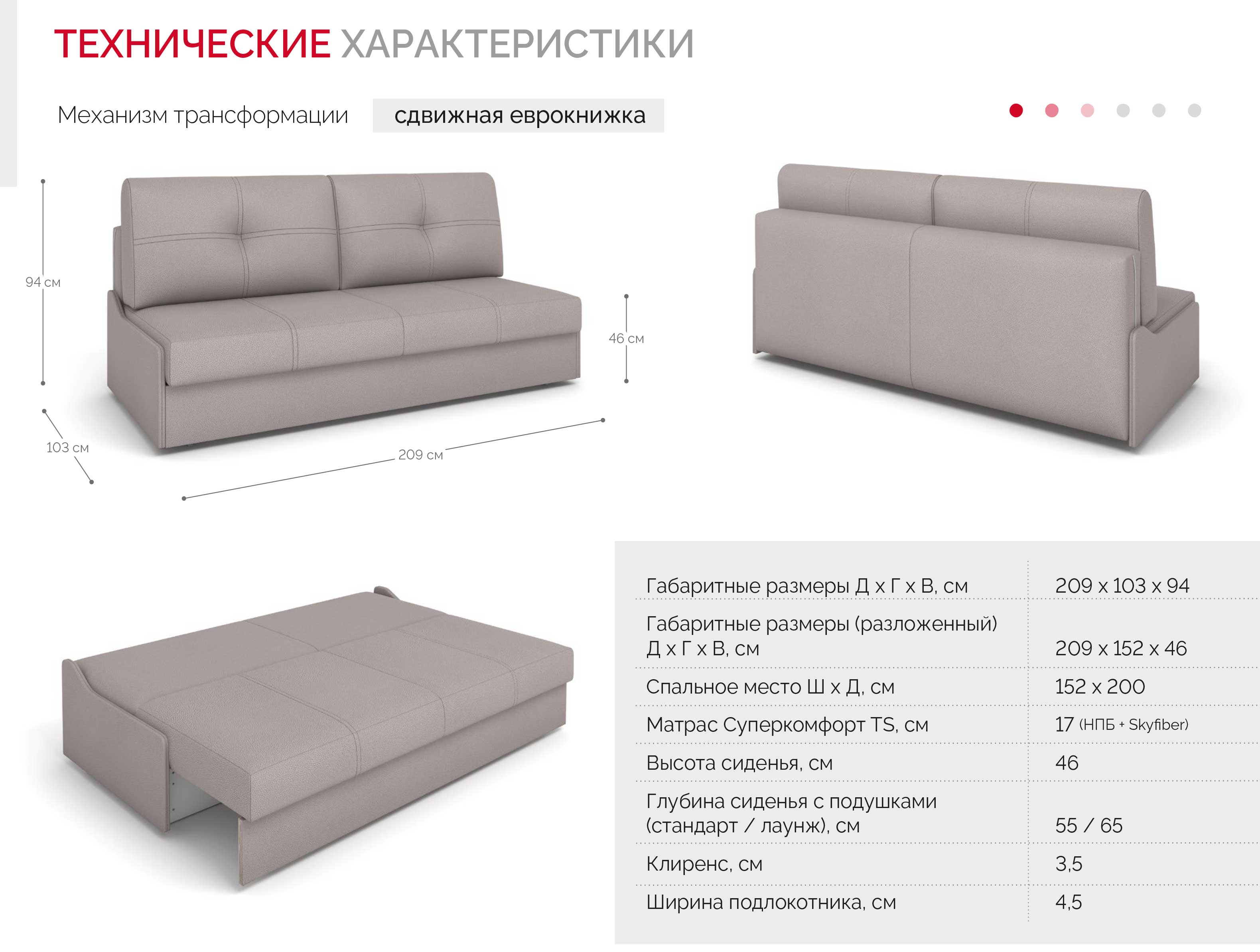 Уникальный механизм трансформации — сдвижная еврокнижка — позволяет легко и бесшумно разложить диван в положение кровать, что особенно важно для ежедневного использования. Второе положение — лаунж: достаточно сдвинуть сиденье вперёд, чтобы получить глубокую посадку для расслабления и просмотра фильмов. Скрытые подлокотники добавляют дополнительное удобство без загромождения пространства. Прочная конструкция на основе металлокаркаса и ЛДСП обеспечивает долговечность и надёжность эксплуатации.
