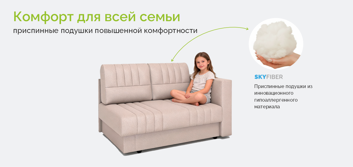 • Приспинные подушки с наполнителем из инновационного материала Skyfiber – современный гипоаллергенный материал, обладает высокой воздухопроницаемостью и упругостью, не крошится, быстро восстанавливает форму и не дает усадки.