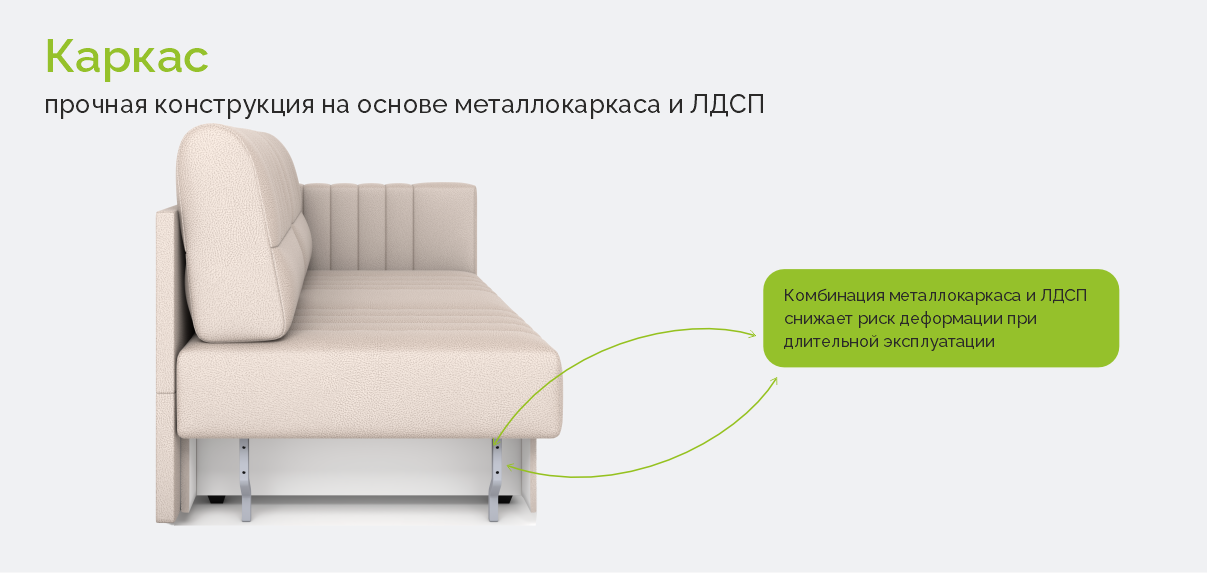 • Каркас – прочная конструкция на основе металлокаркаса и ЛДСП. Распределенная нагрузка на изделие – до 120 кг